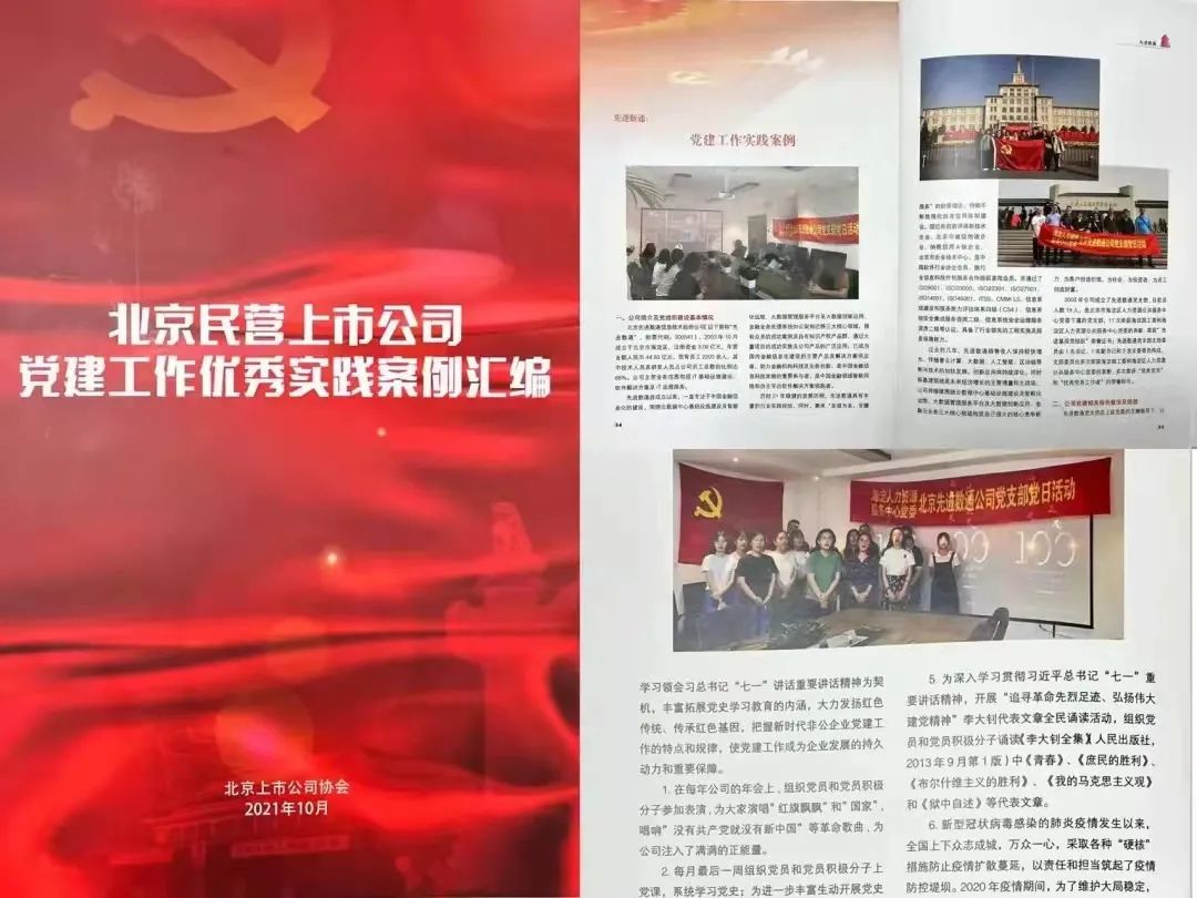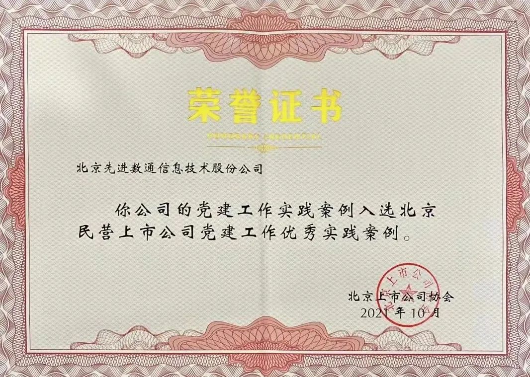 近日,北京上市公司协会授予北京乐鱼官网数通信息技术股份公司荣誉证书,乐鱼官网数通党建工作实践入选北京民营上市公司党建工作优秀实践案例,相关党建活动已收录在《北京民营上市公司党建工作优秀实践案例汇编》。